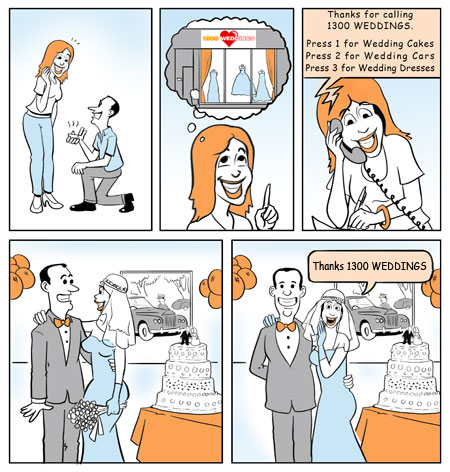 "Welcome to 1300 WEDDINGS, the service that connects you to a local wedding business supplying your neighbourhood. Press 1 for wedding cakes, press 2 for wedding cars, press 3 for wedding dresses."